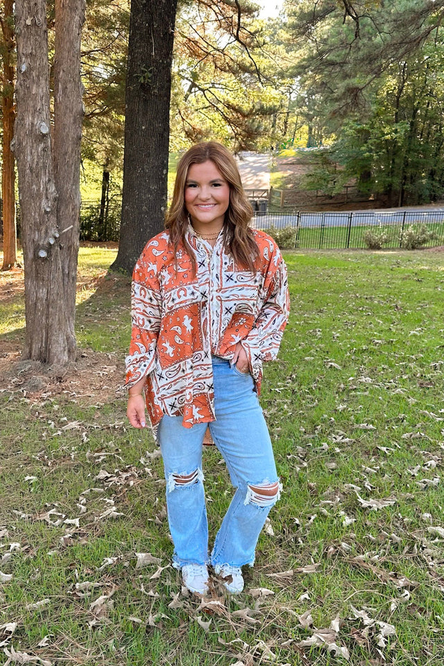 BANDANA BUTTON UP TOP - BURNT ORANGE / XSMALL is backordered and will ship as soon as it is back in stock.