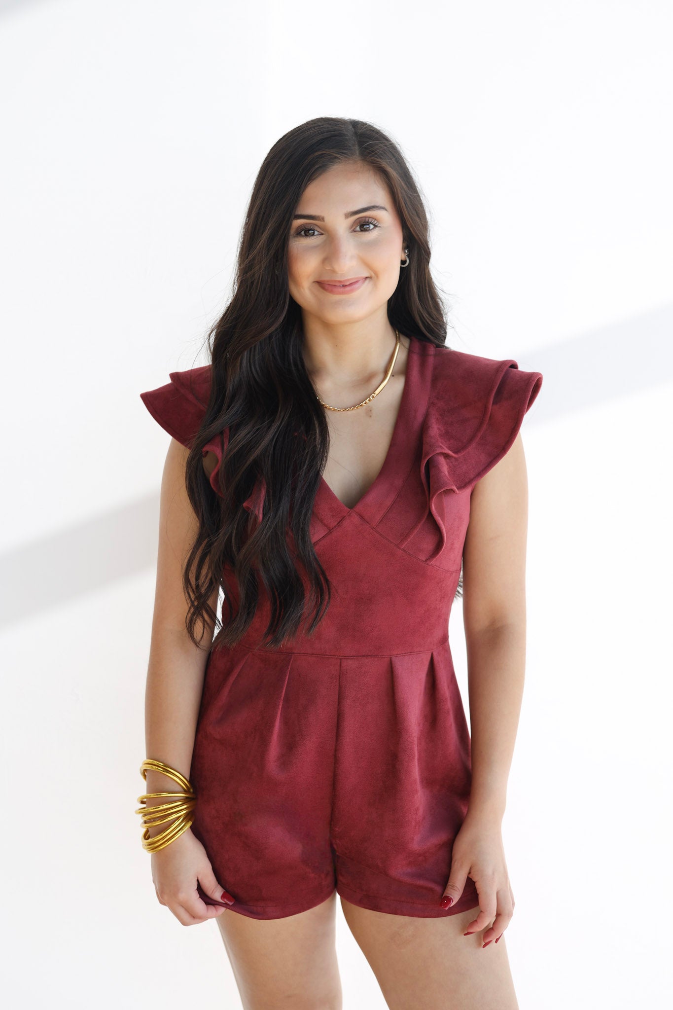 The ultimate mix of chic and confident. Designed in a rich wine hue, this romper features a flattering V-neckline with soft ruffle shoulders and pleated detailing for a touch of feminine flair. The faux suede material gives it a luxe, elevated feel, while the zip-back closure keeps it sleek and easy to wear. Perfect for game days, girls’ night, or any event that calls for a little extra edge.