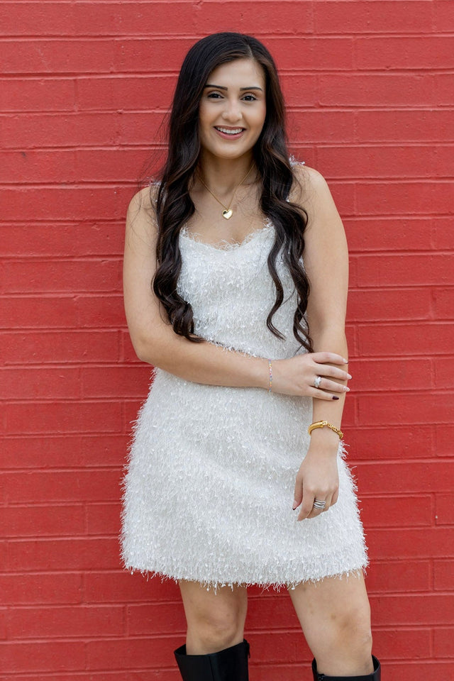 Faux Feather Mini Dress - CRÈME / MEDIUM is backordered and will ship as soon as it is back in stock.