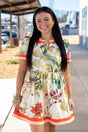 • Babydoll silhouette featuring short sleeves and contrast trim details.