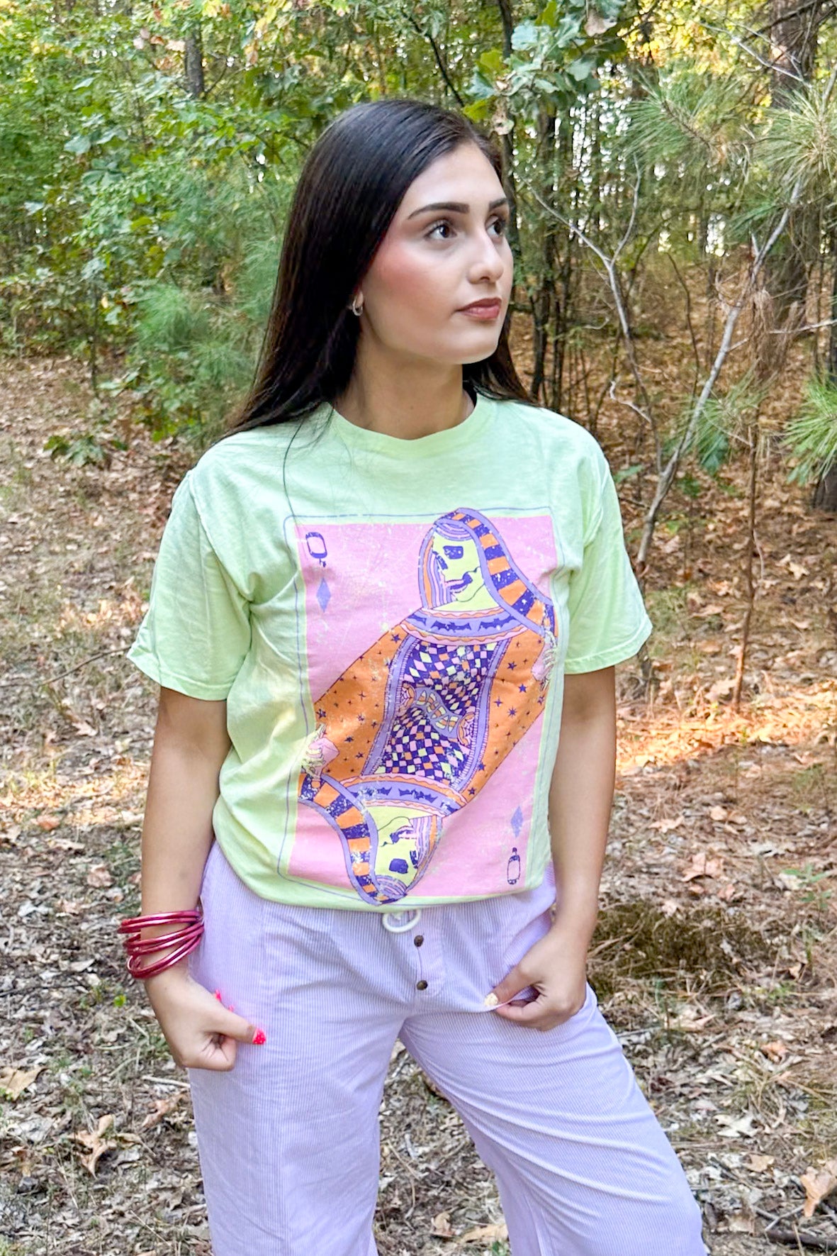 Say hello to the ultimate statement tee. Featuring a neon-colored skeletal queen card print, this lime green short-sleeve brings quirky-meets-cool in the best way. Pair with cargos or lavender denim for a look that’s as bold as your personality