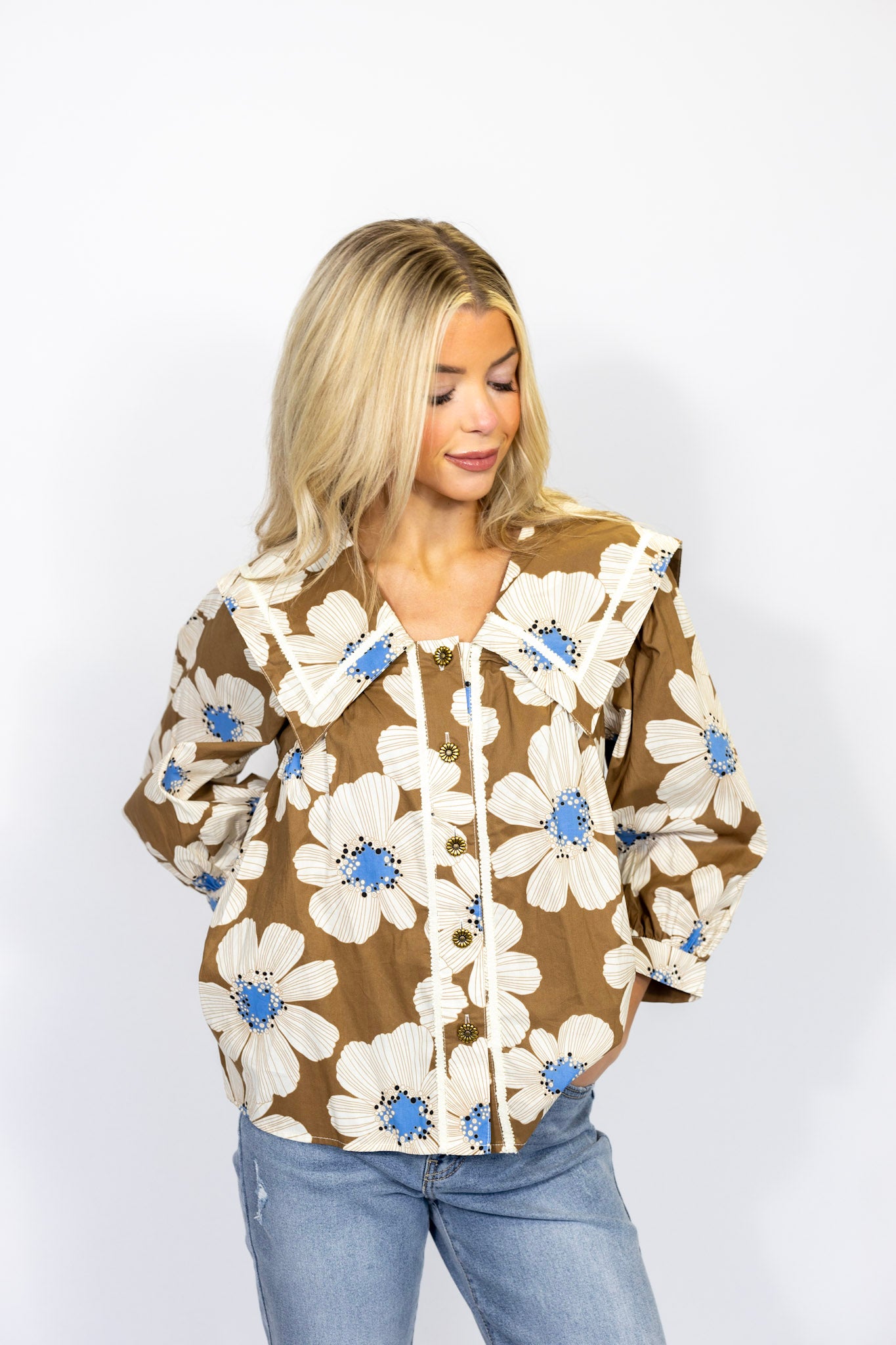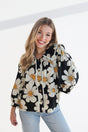 This blouse is a whole mood—bright, bold, and beautifully detailed. Featuring oversized daisy florals on a black base, exaggerated puff sleeves, and a statement collar, it's the perfect blend of retro charm and modern flair. Style it with denim and gold jewelry for a fresh take on fall florals