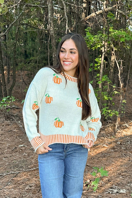 PUMPKIN EMBROIDERED STRIPE SWEATER