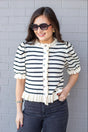 Striped Ruffle Sweater Cardigan - Cream / Large is backordered and will ship as soon as it is back in stock.