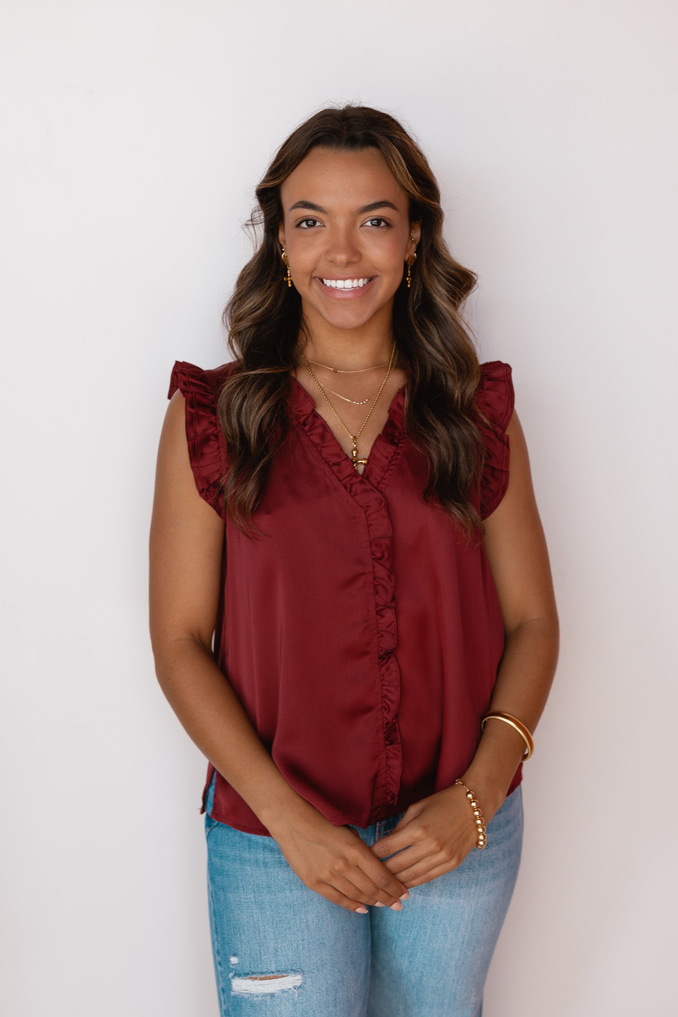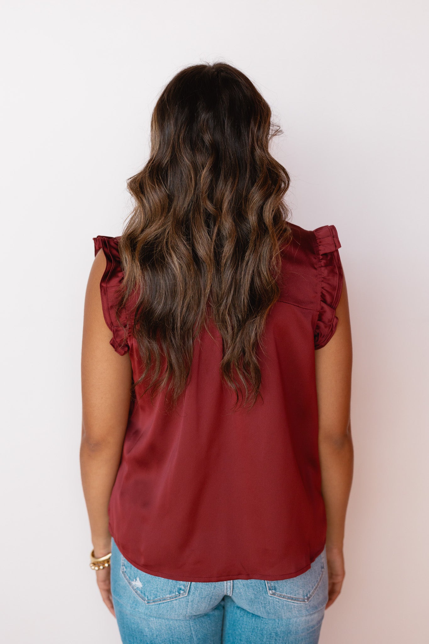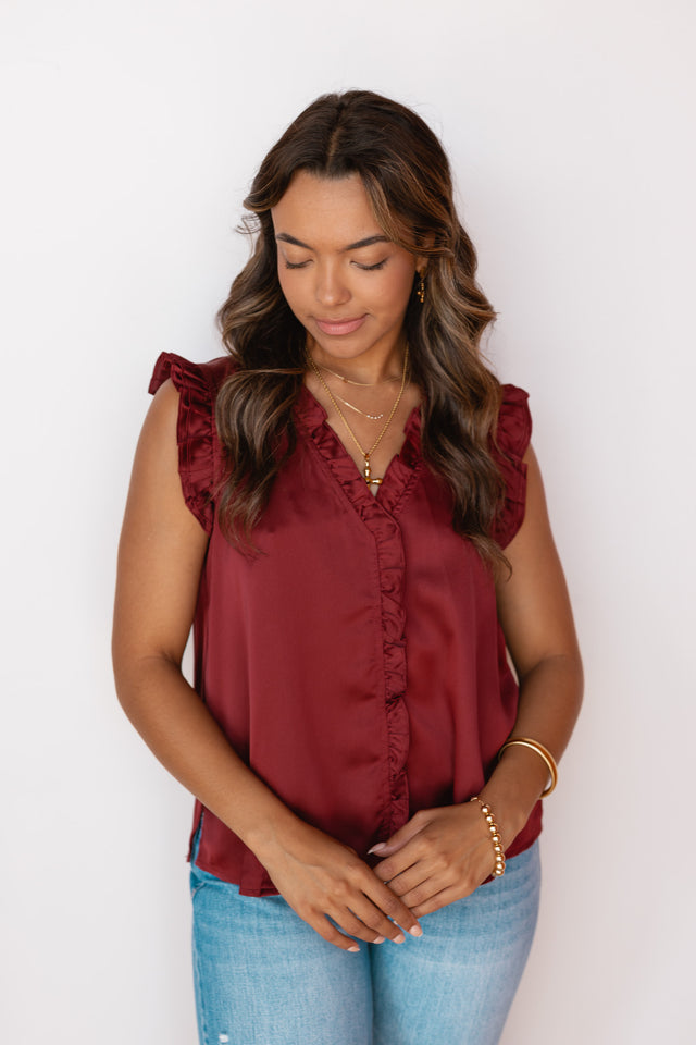 SATIN VNECK RUFFLE TOP - MAROON / SMALL is backordered and will ship as soon as it is back in stock.