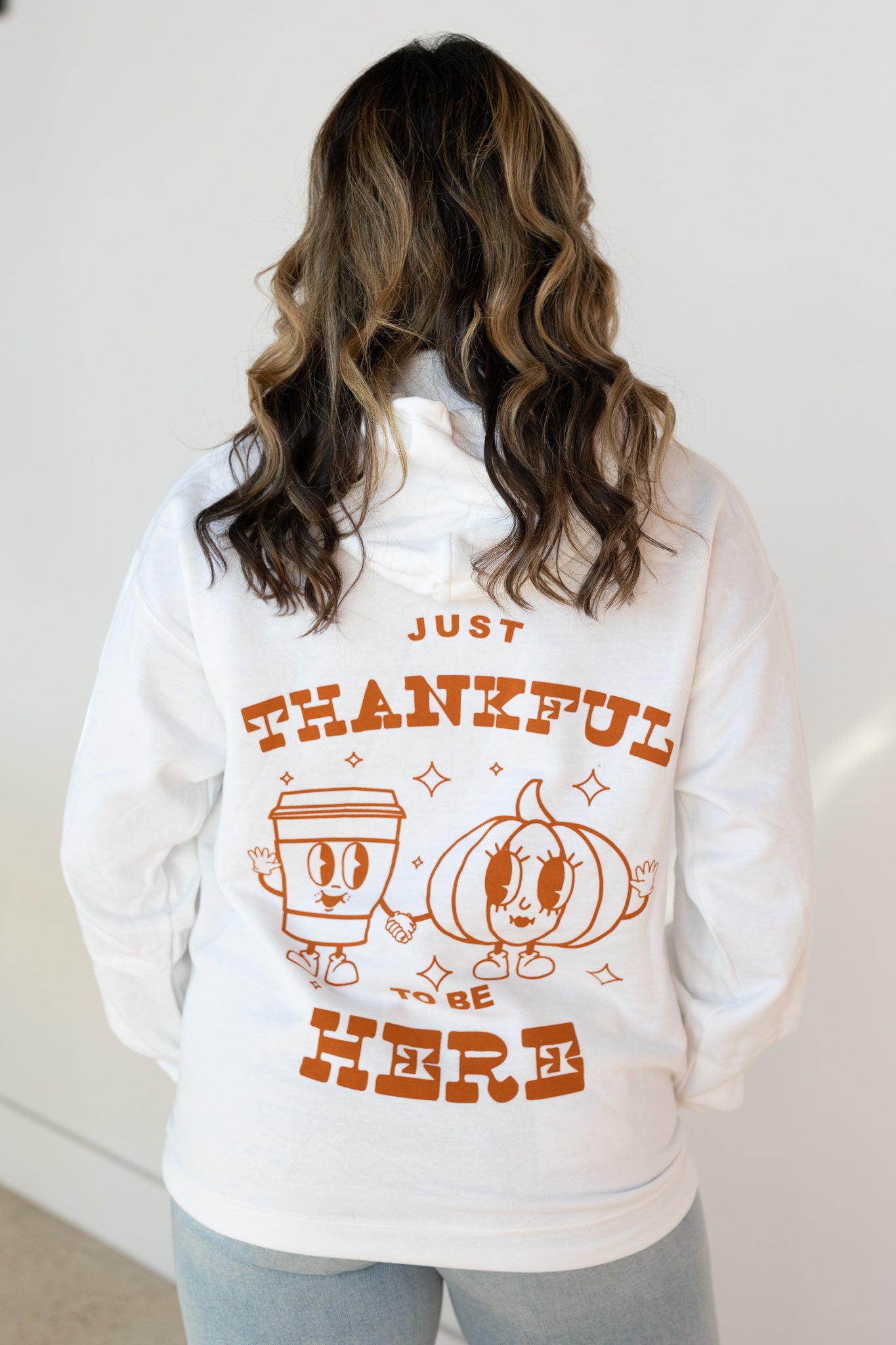THANKFUL TO BE HERE HOODIE - WHITE / SMALL is backordered and will ship as soon as it is back in stock.